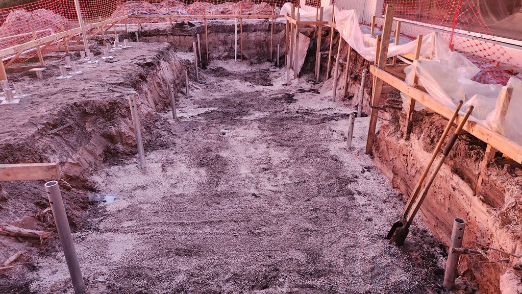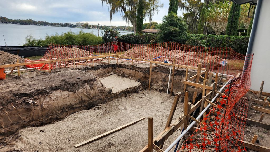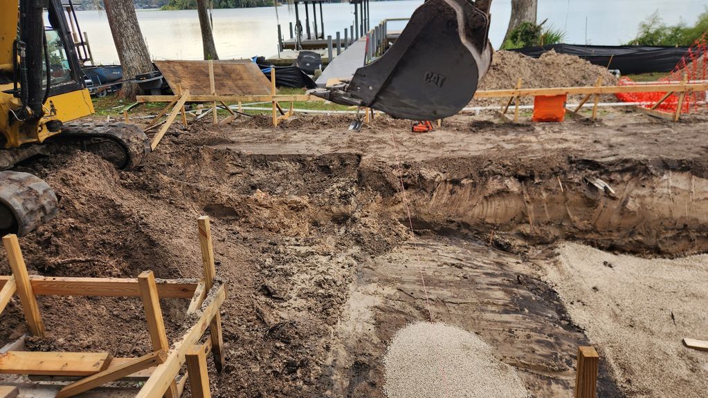Frist, the hole for the pool is dug and then a layer of pea gravel is added, by others.